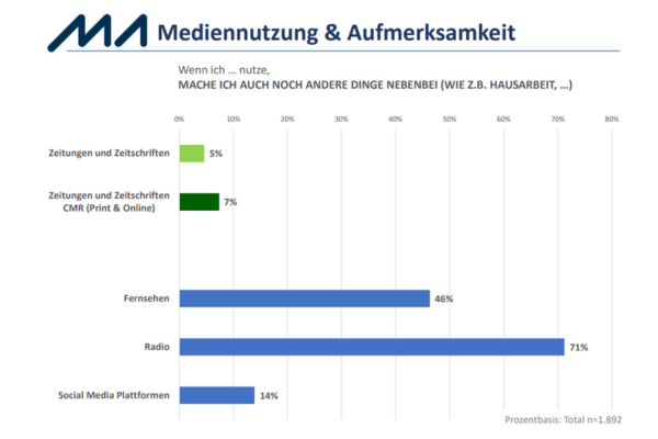 So erledigen bei Zeitungen und Zeitschriften nur 7% (CMR – Print und Online) nebenbei andere Tätigkeiten. Bei Social Media sind es 14%, bei Fernsehen 46% und bei Radio gar 71%.